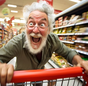 I could get the plain and some fresh strawberries, liquidise some and mix them in? I’ll maybe get two dessert spoons of yoghurt to eat. Is it worth it for all that effort? Where’s the chocolate trifle kept? Nooooo. With practice, this is all done with one glance. You’ll become an expert.